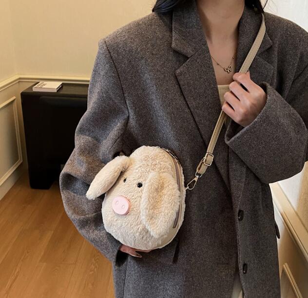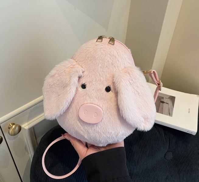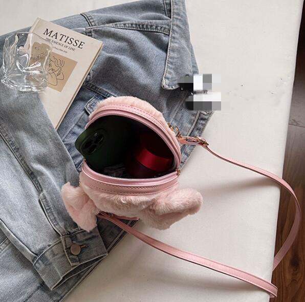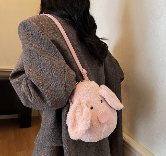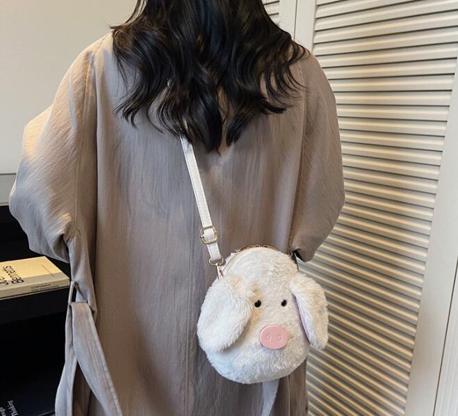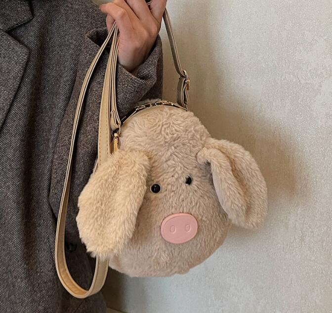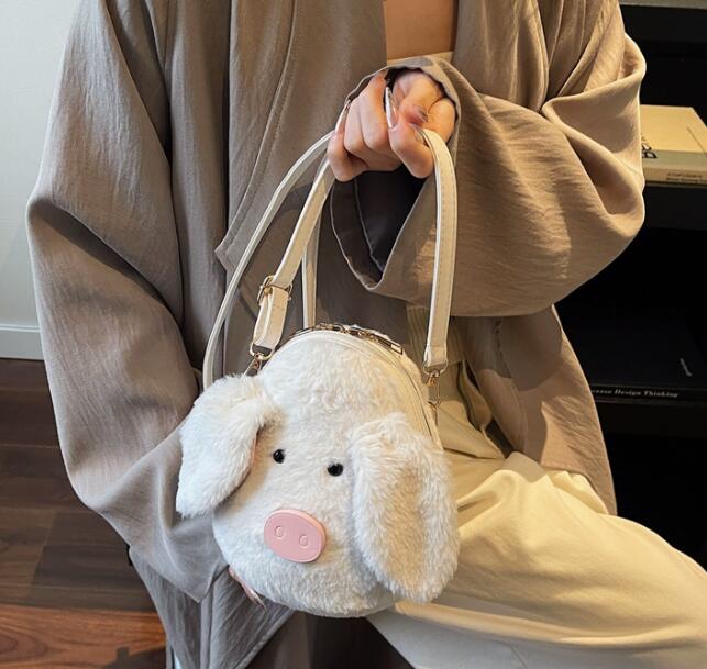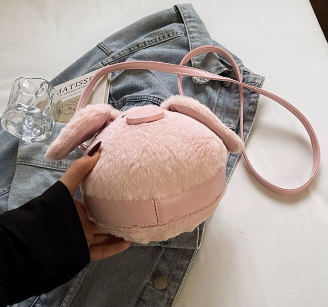 ふわふわのフェイクファー素材で作られた可愛いぬいぐるみデザインが特徴的。