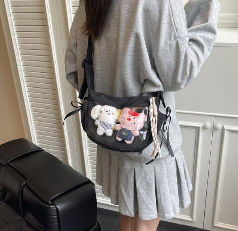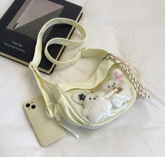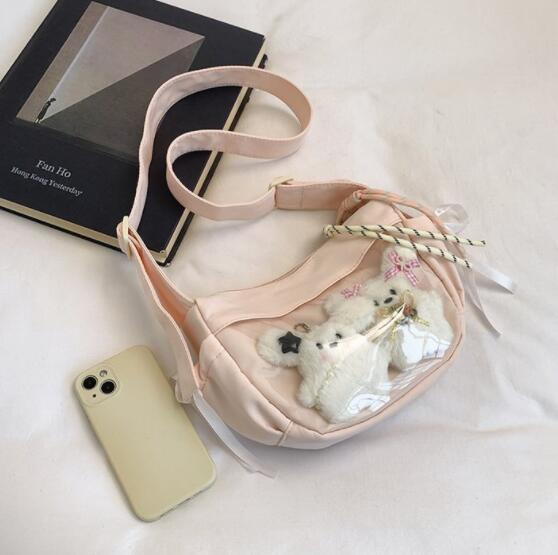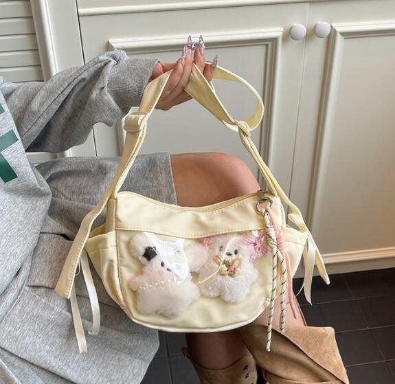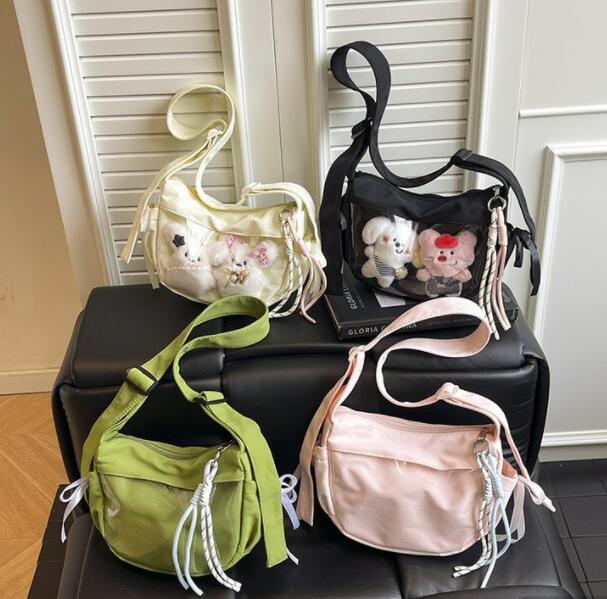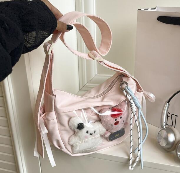 リボンなどの装飾が施された上品なデザインが特徴的なナイロンショルダーバッグです。